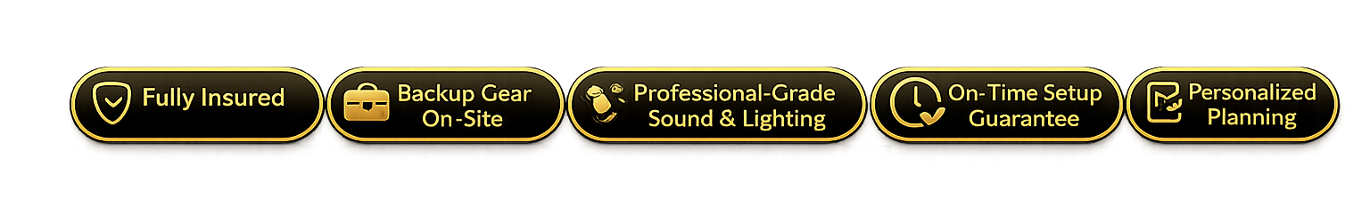 Starting pricing reflects base coverage. Base coverage consists of a basic sound system, one person DJ/MC, and an illuminated facade/frontboard. Final pricing depends on event type, hours, location, and production needs (DJ/MC, lighting, photo booth, ceremony audio, and corporate A/V).