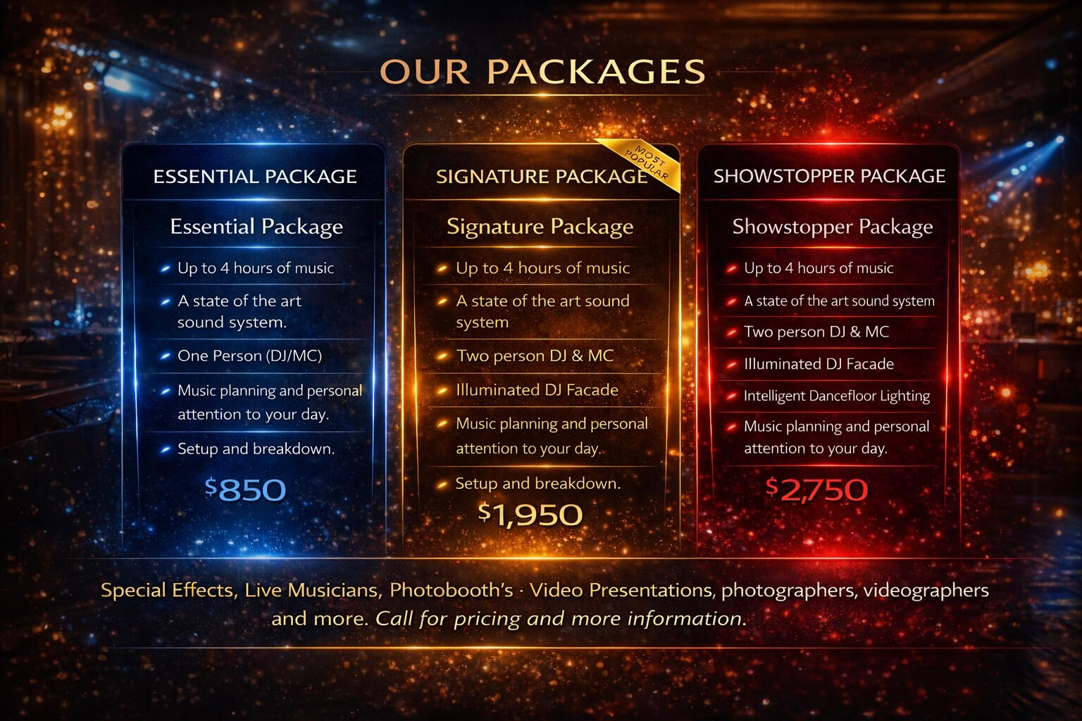 Packages are customized based on your event type, hours, location, and production needs (DJ/MC, lighting, photo booth, and corporate A/V).